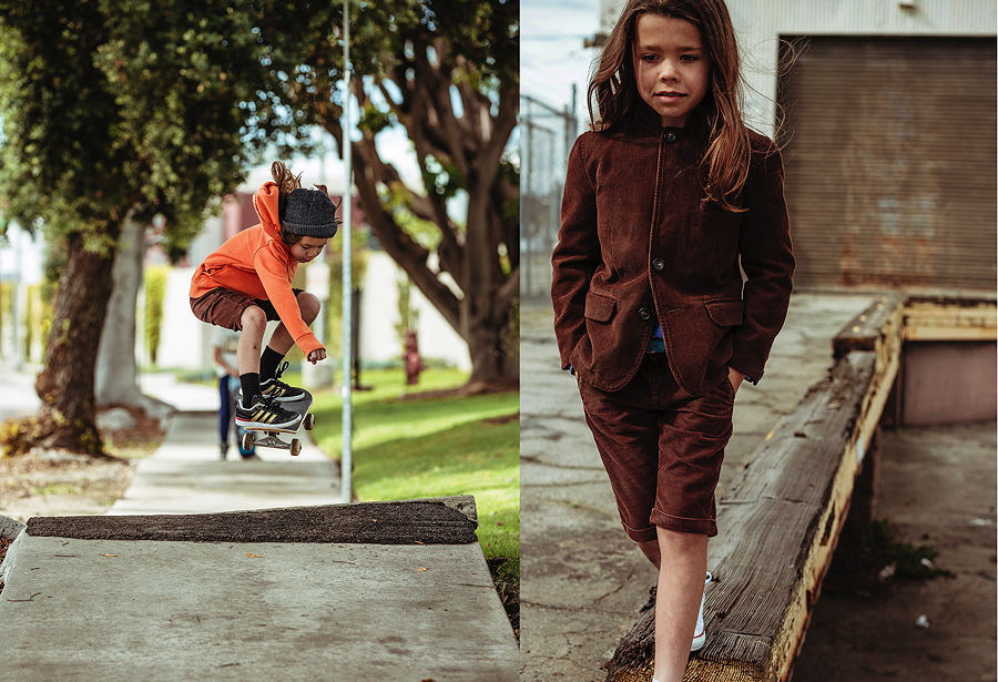 Als würde die Savile Row quer durch Los Angeles verlaufen – die Mode von ABC123me verbindet amerikanische Lässigkeit mit britischer Attitüde. Sehr klassisch und dennoch entspannt wirkt der Anzug aus Softcord. Mit der Kombination aus Blazer und Skater-Short lässt es sich bequem die Schulbank drücken, danach geht es ab auf die Halfpipe!