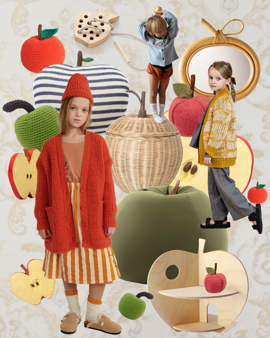 Outfit von Popelin via Ladida | Spiegel „Miroir Pomme“ von Bonton | Apfel-Buchstütze und Türstopper von Bloomingville | Outfit von Paade Mode | Holzpuppenhaus „Apple House“ von Rock & Pebble | Apfel-Sitzsack von Sitting Bull | Geflochtener Apfel-Korb von Ferm Living | Outfit von Weekend House Kids | Badespielzeug und Teether „Pepita the Apple“ von Oli & Carol | Häkelrassel „La Pomme“ von MyuM | Apple Pillow von Oeuf NYC | Gehäkelte Apfelrassel von Anne-Claire Petit | Holzspielzeug Apfel aus Eschenholz mit Wurmkordel von Grüne Erde.