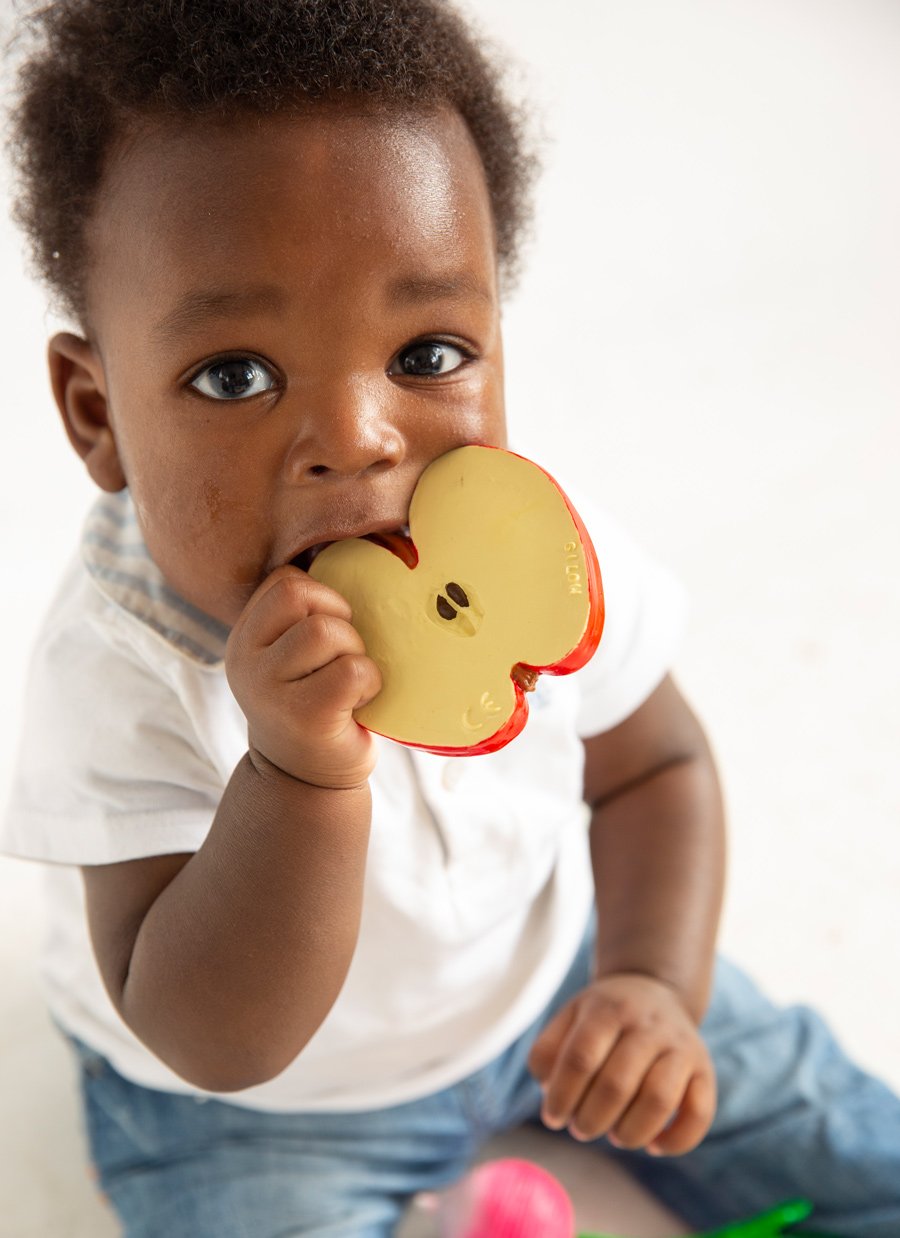 Es mag Apfel-Sommeliers geben, die essen ihre ersten Äpfel im Herbst gepflegt mit Messer und Gabel. Doch wir sind uns alle einig: Nichts geht über das herzhafte Reinbeißen, dass der Saft spritzt. Bei Oli & Carol pfeift man ebenfalls auf Knigge – der Apfel Pepita aus ihrer ökologischen Obst- und Gemüsezucht verführt zu ausgedehntem Kau- und Knabbervergnügen und ist dabei völlig unbedenklich, weil zu 100% aus Naturlatex und mit lebensmittelechter Farbe verziert.