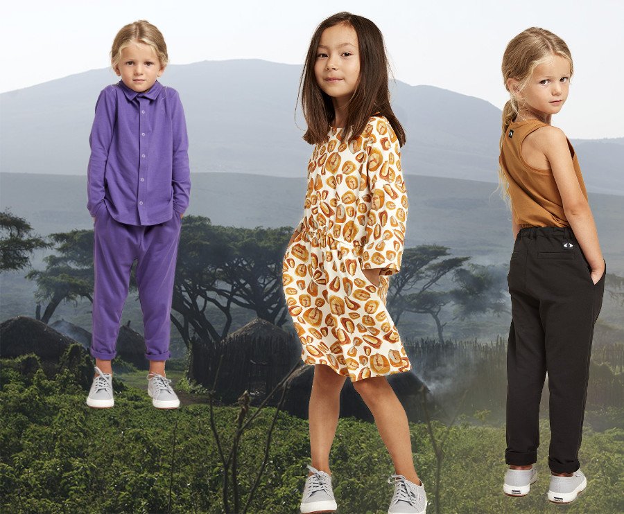 Die stolzen Massai-Krieger in ihren leuchtend roten Gewändern, die unendliche Weite der Savanne, duftende Kaffeeblüten und Giraffen, die sich mit Anmut über die Steppe bewegen, als wären sie langstielige, gefleckte Riesenblumen … Mit Poesie verneigt sich Karen Blixen in ihren Memoiren vor der Schönheit Afrikas, vor einer „dunkel lockenden Welt“, die jetzt auch Piñata Pum in den Bann gezogen hat: „Kenya“, die neue Kollektion des Kindermodelabels aus Barcelona, zeigt afrikanisch inspirierte Mode.