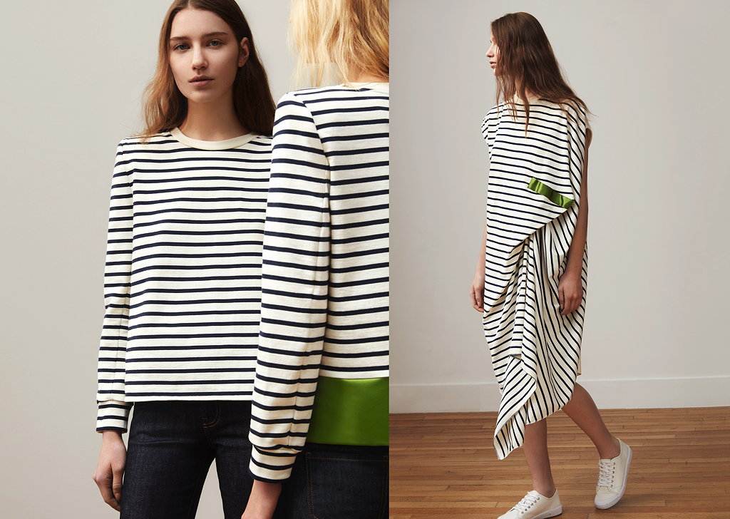 Die Marinière, neu interpretiert von der Designerin und ein kunstvoll drapiertes Jerseykleid. © Thomas Lohr