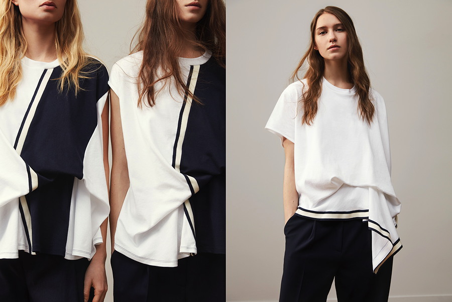Für die vierteilige Kollektion nutzte Annelie Schubert ihre Carte Blanche-Gelegenheit, um den altbewährten Petit Bateau-Klassikern neues Leben einzuhauchen. Der Marinière hat sie Schulterpolster eingesetzt und den Klassiker auf der Rückseite mit einem Einsatz aus Duchessesatin versehen, was für einen überraschenden Effekt sorgt. Der für Petit Bateau typische Baumwolljersey hat sich in den Händen von Annelie Schubert in zwei raffinierte T-Shirts und ein kunstvoll drapiertes Kleid verwandelt. Farblich orientiert sich ihre Kollektion an der Farbpalette des Kultlabels: Ecume Weiß, Coquille Beige und ein rauchiges Blau – einzige Ausnahme ist ein Hauch von Khakigrün.