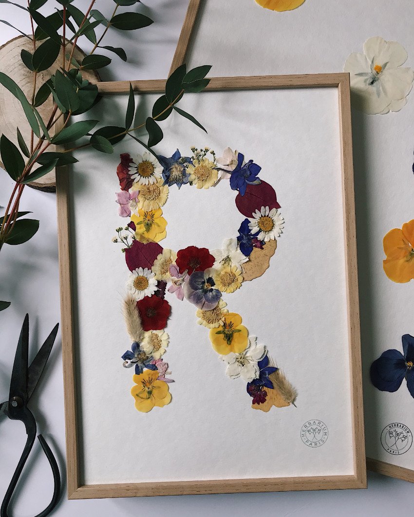 Blumen pressen erinnert an die eigene Kindheit und ist gerade total angesagt! Auf der floralen Nostalgiewelle schwimmt auch das Pariser Atelier HERBARIUM. Unter dem Leitmotiv „Pressed flowers are forever“ fertigen die Herbalovers der Seine-Metropole Kunstwerke aus getrockneten Blüten. Wer z.B. ein besonderes Taufgeschenk sucht, der kann die Blumenlettern von A bis Z über den Onlineshop in Auftrag geben.
