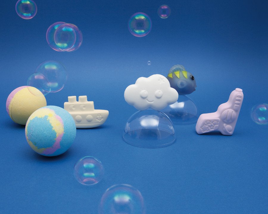 Wellness Badespielzeug für Kinder: die Seifen duften nach Ananas-Kokos, Himbeere oder Pfirsich; die Badekugeln wirken entspannend