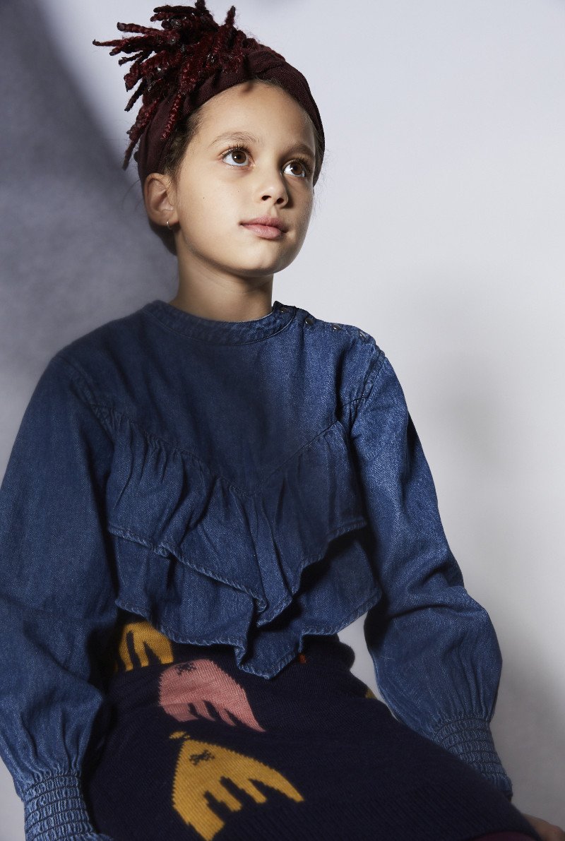 Farm meets Future: Lonesome Cowgirl Edith kombiniert ihre Denimbluse von FINGER IN THE NOSE zum Rocket Skirt von FRESH DINOSAURS, Haarband PHIL & PHAE