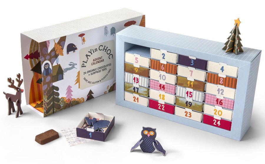 Schokolade im Kinderzimmer. Für viele Eltern ein Graus, für Maya Simler ein voller Erfolg. Unter ihrem Label PLAYIN CHOC entwirft die Londonerin tierisch süßes Papp-Spielzeug zum Zusammenbauen inklusive veganer Schokolade ohne raffinierten Zucker. Die gesunde Antwort auf das Ü-Ei gibt es jetzt auch als Adventskalender: Die 24 Schubladen sind jeweils bestückt mit einem 3D Puzzlespielzeug, einer „Fun Facts“-Karte sowie mit zwei Stücken der preisgekrönten PLAYIN CHOC Schokolade. Für verspielte Naschkatzen und alle, die das Ü-Ei so was von über haben. Zu kaufen im brandeigenen Onlineshop.