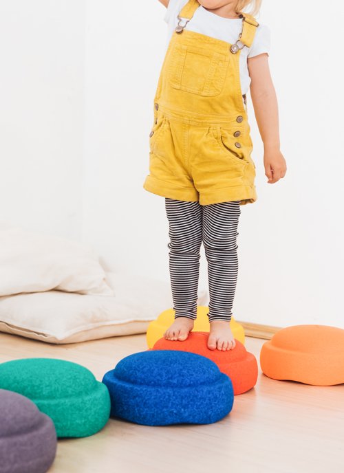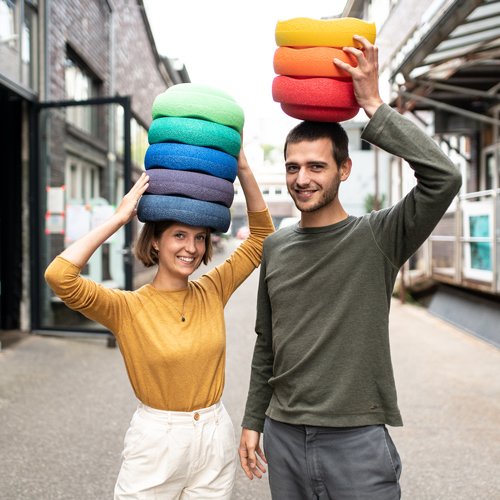 HK: Neue kreative Spielideen werden uns mittlerweile nicht nur von Kindern gezeigt. Auch bei Erwachsenen sind die Stapelsteine zum Beispiel als Fitnessgerät, Balance-Trainer oder höhenverstellbare Hocker im Home-Office sehr beliebt. Wir selbst schätzen die Stapelsteine als bewegendes Element in unserem Arbeitsalltag.