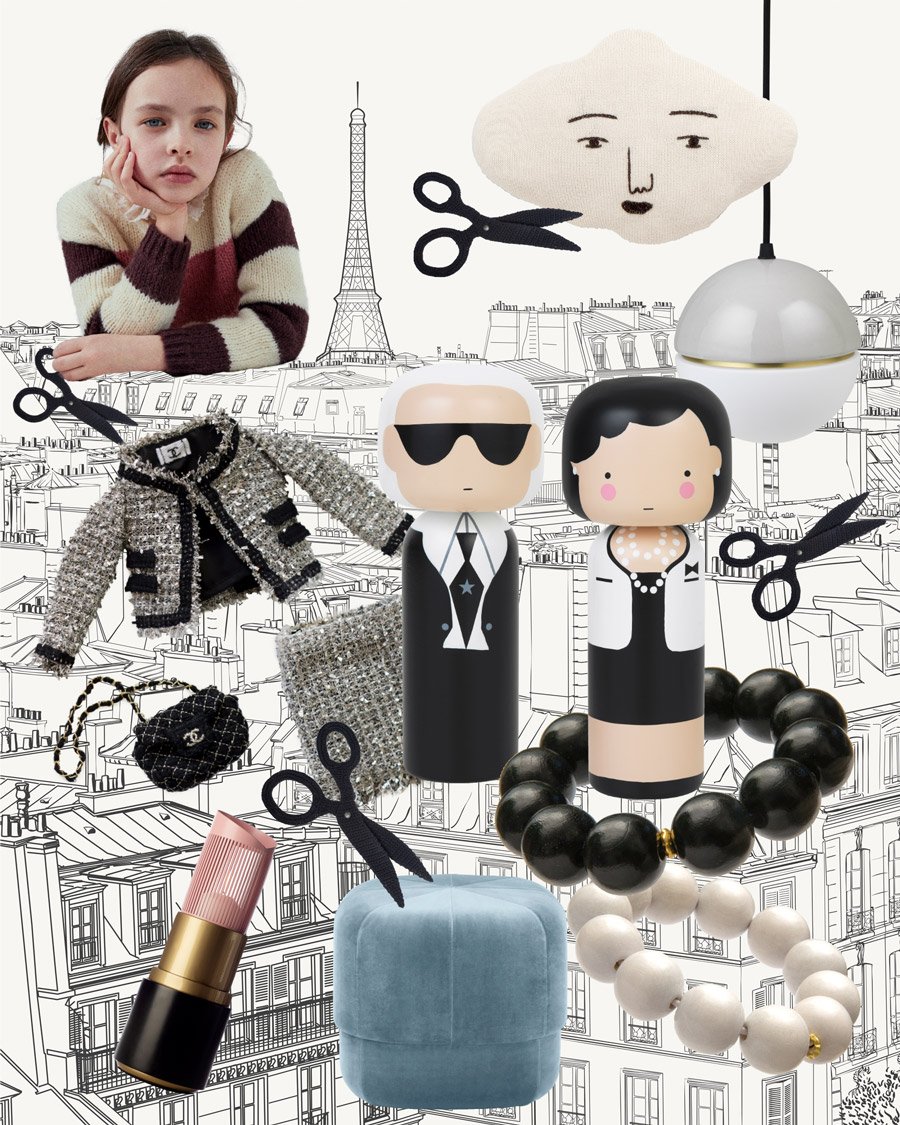 Bonjour Paris! Mit diesen Deko-Objekten und Accessoires weht ein Hauch Rue Cambon durchs traute Heim (von oben nach unten im Uhrzeigersinn): Tapete „Paris Rooftop“ von Murals Wallpaper | Gehäkelte Schere von Anne-Claire Petit via Spiegel Amsterdam | Wolken-Kissen von Oeuf NYC | Hängelampe „Macaroon“ von Lucie Kaas | Kokeshi Dolls Coco und Karl von Lucie Kaas | Woody Bracelets von Mamaradscha | Circus Pouf von Normann Copenhagen via Ikarus | Outdoor-Laterne „Lipstick Lantern“ von Garden Glory | Chanel Tweed Kostüm (passend zur Puppe) auf Anfrage via Severina Kids | Strickpullover Irene von The New Society.