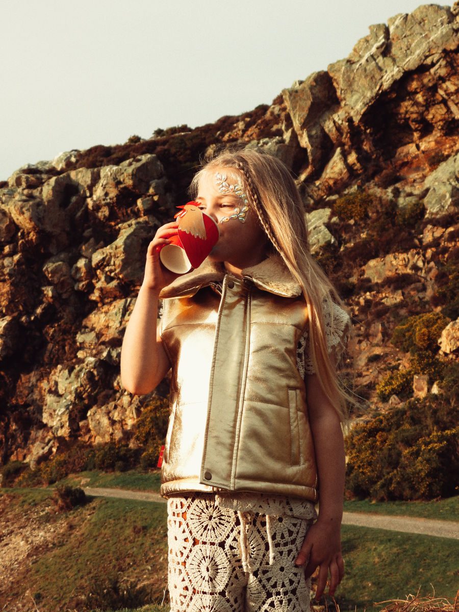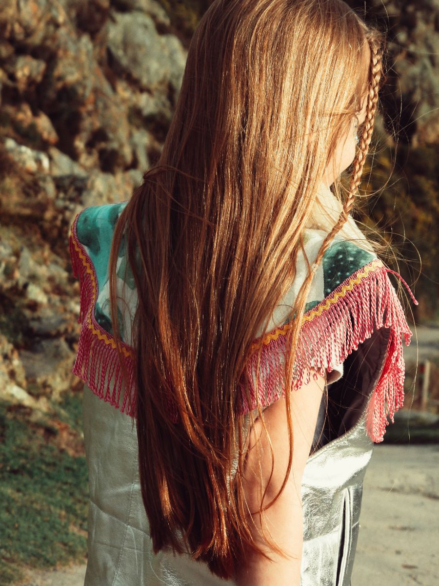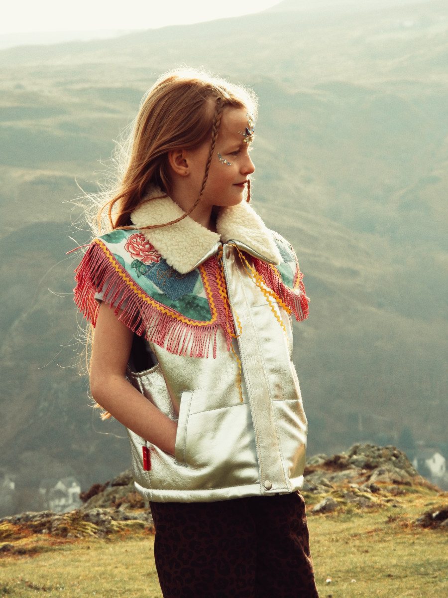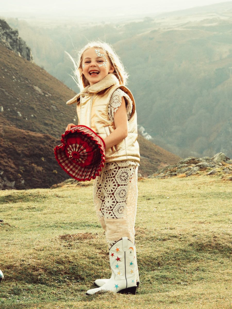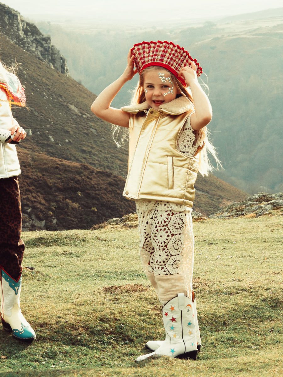 Sonnenuntergang in der Prärie: Passend dazu trägt Cowgirl Amelia das Sun Headband von MERI MERI, Lederweste FILLE GARÇON