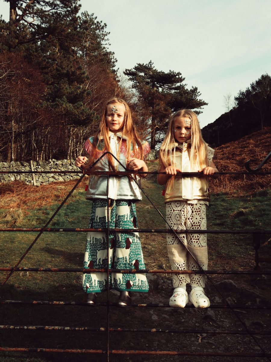 Der wilde, wilde Stilmix: Zur Metallic-Weste trägt Amelia eine Strickhose von MOMOHANIPOPO, Jessica kombiniert CROCS zur Crochet-Hose von ROCKFORD & CO