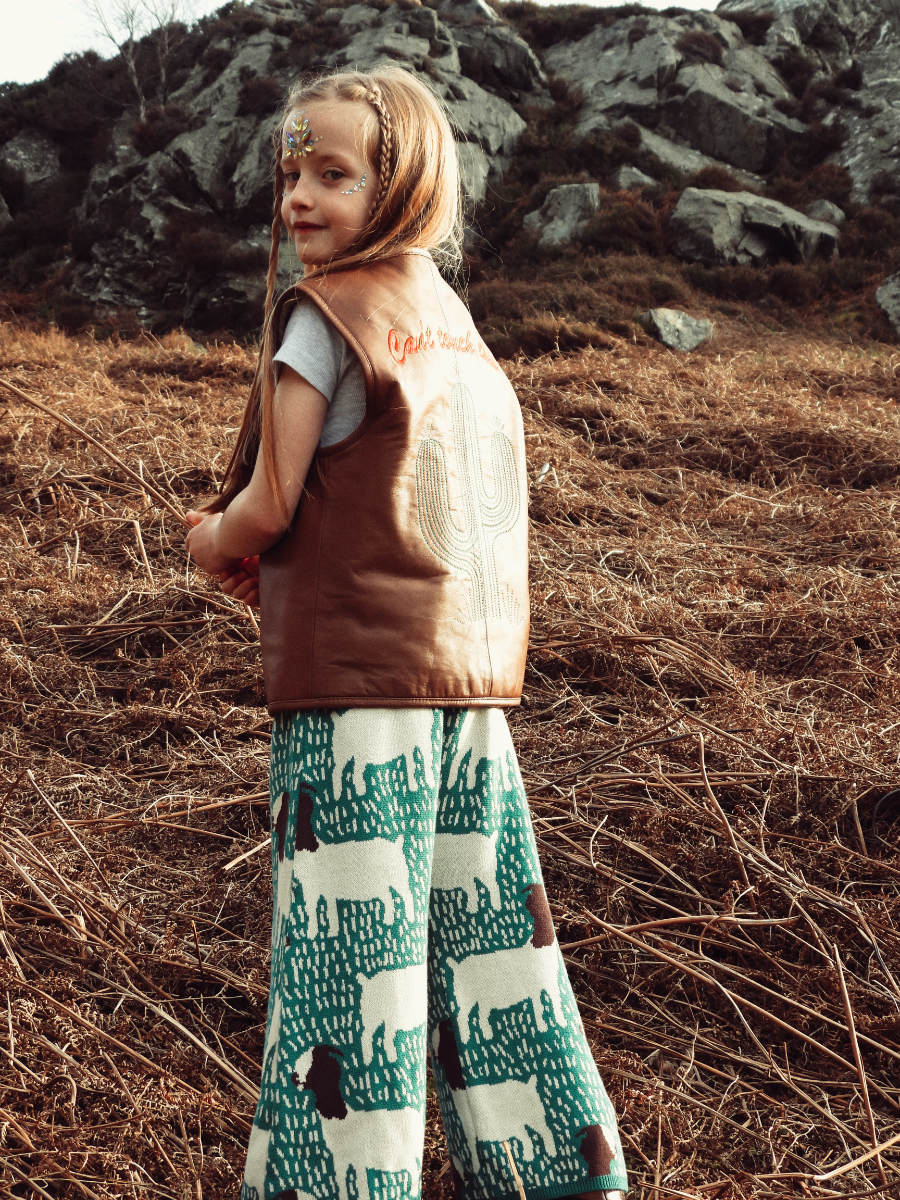 Ziegen hüten in style: Amelias Strickhose im Goat-Allover-Muster stammt von MOMOHANIPOPO, die Lederweste von FILLE GARÇON