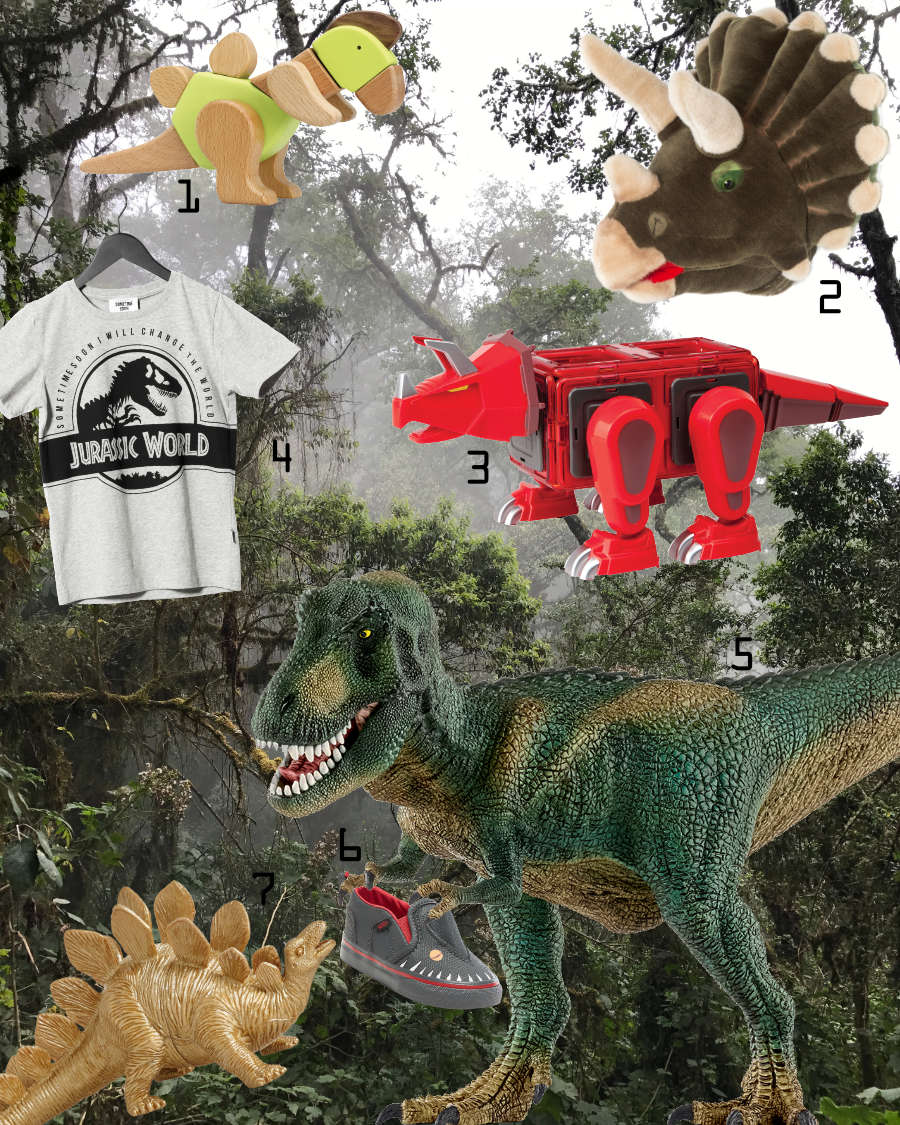 Vom Dinosaurier Spielzeug bis zum Kultsneaker … alle It-Pieces haben wir hier verlinkt: Klick‘ einfach auf den jeweiligen Onlinestore und gelange so zu deinem Wunschobjekt: 1 Kreativ-Bausatz von Small Foot Design | 2 Dinosaurier-Trophäe von Wild & Soft | 3 Magnet-Bausatz von Magformers | 4 T-Shirt von Sometime Soon x Jurassic World | 5 Tyrannosaurus Rex von Schleich | 6 Dino-Slip-Ons von Vans | 7 Spielzeug-Dinosaurier von Rice.