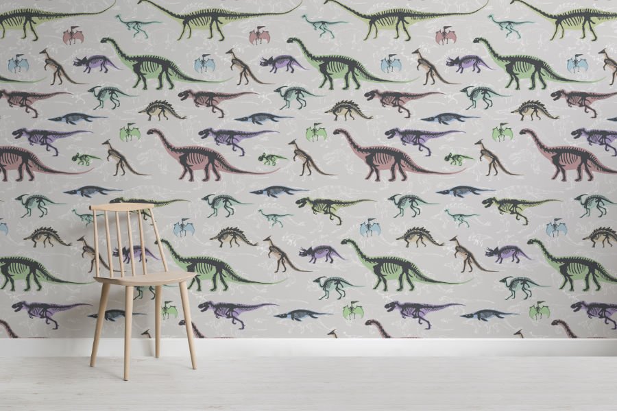 Bunte Dinosaurier-Skelette bilden die perfekte Kulisse für ein Kinderzimmer im Jurassic World Komplett-Look