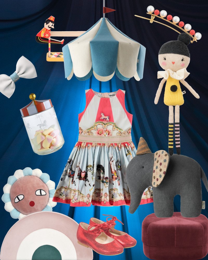 Für eine filmreife Zirkusnummer! Das sind die Stars in der Manege (von oben nach unten im Uhrzeigersinn): Pendelleuchte Circus von buokids via itkids | Hair Clip von The Animals Observatory | Luftakrobatin Isadora von Lauvely | Zirkus Elefant von Maileg | Circus Pouf von Normann Copenhagen | Mary Janes von Manuela de Juan | Regenbogen Hocker aus Samt von Maison Deux | Blumenkissen Polly von Lucky Boy Sunday | Carousel Kleid von Molo | Circus Vorratsdose von Alessi | Hair Clip Bow von Milledeux | Zirkusakrobat aus Holz von Vilac.