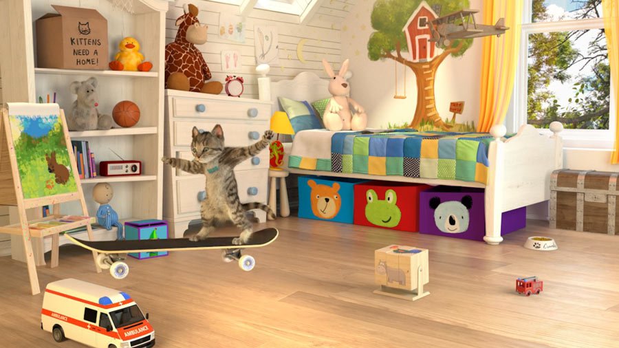 Mit Vollgas durchs Kinderzimmer: Neben waghalsigen Skateboard-Tricks hat der Stubentiger auch akrobatische Luftsprünge im Repertoire