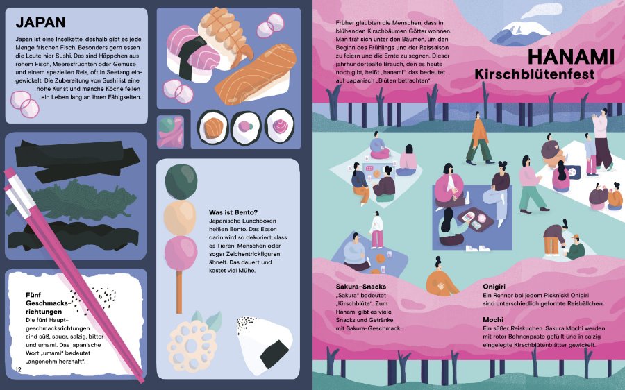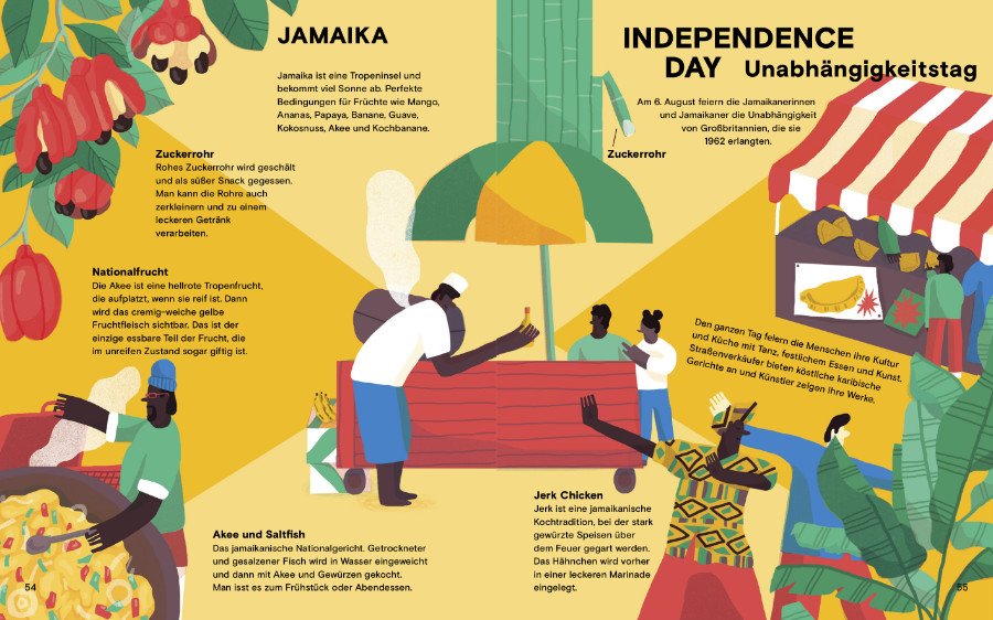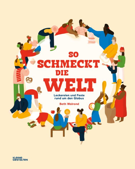 KRAUTS, NOODLES, BAGELS – allesamt Spitznamen für europäische Einwanderer in die USA. Millionen Menschen hatten ihre Heimat hinter sich gelassen, ihre familiären Bindungen gekappt, bald auch ihre eigene Sprache aufgegeben. Einzig beibehalten haben sie ihre von der Tradition geprägten Essgewohnheiten. Dass sich Essen so tief einprägt, hat wohl mit dem ganzen sozialen Drumherum zu tun, vor allem mit den Festen, zu denen bestimmte Gerichte unweigerlich gehören. Lassen wir uns einladen: Der Verlag Kleine Gestalten tischt uns in seinem reichlich illustrierten Kinderbuch „So schmeckt die Welt. Leckereien und Feste rund um den Globus“ Gerichte aus aller Welt auf.