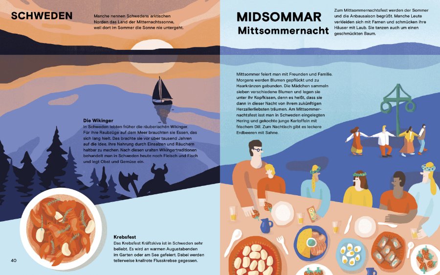 Bald ist wieder Midsommar. Seit Ikea weltweit zwischen Möbelregalen zur Sommersonnwendfeier einlädt, ist dies ein allseits bekanntes schwedisches Fest. Im klaren Scandie Style sind auch die Midsommar-Gerichte gehalten: Glasmästerssill, eingelegte Heringe zu neuen Kartoffeln und zum Nachtisch Erdbeeren mit Sahne. Der dazu reichlich genossene Aquavit erfährt selbstredend keine Würdigung. Es handelt sich bei „So schmeckt die Welt“ schließlich um ein Buch für Kinder.