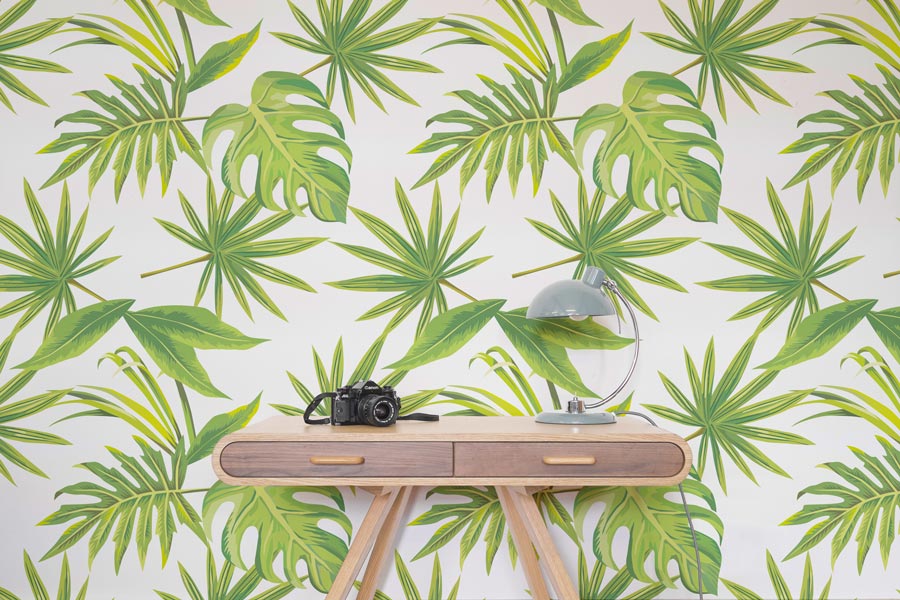 Bringt sattes Leben und den Dschungel Brasiliens ins Haus: die Tapete „Tropical Leaves“ von Murals Wallpaper – © Murals Wallpaper