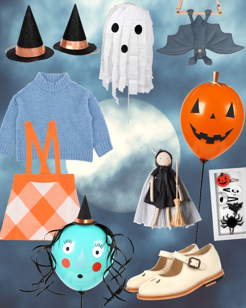 Halloween Kostüme für Kinder dürfen auch mal „süß und sauer“ sein … (Von oben nach unten im Uhrzeigersinn): Fledermaus-Portemonnaie von Donsje | Luftballon Set (Kürbis, Hexe, Gespenst) von Meri Meri | Luna Witch Doll von Meri Meri | Haarspangen von Meri Meri | Mary Janes von Young Soles | Karierter Trägerrock von Tinycottons | Bouclé Pullover von Tinycottons | Mini-Hexenhüte von Meri Meri.