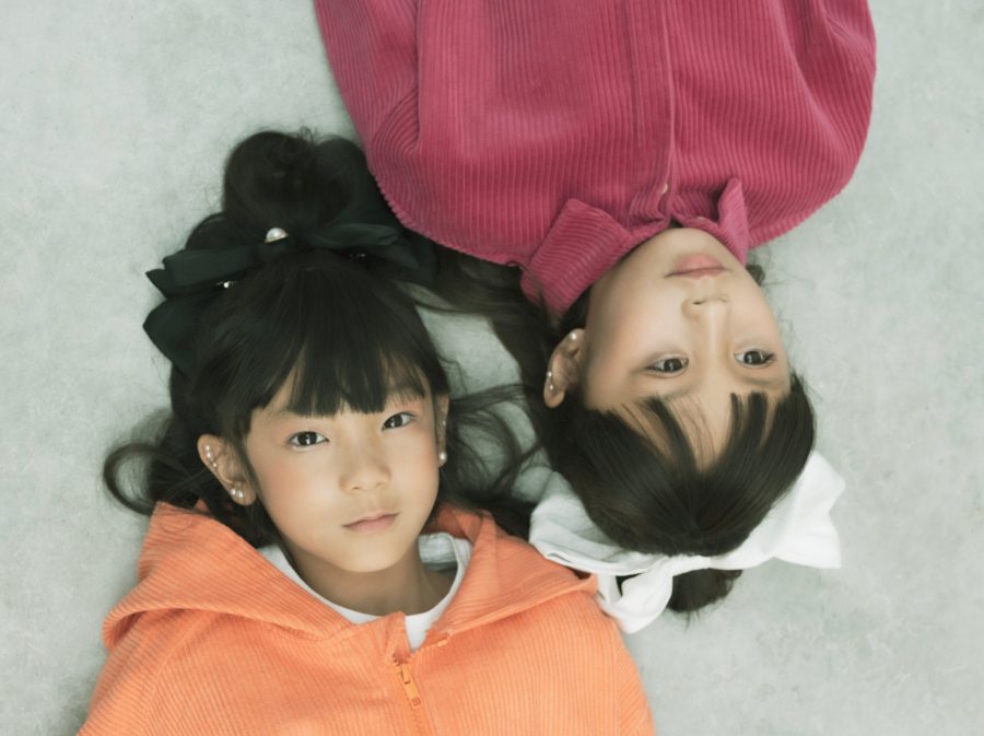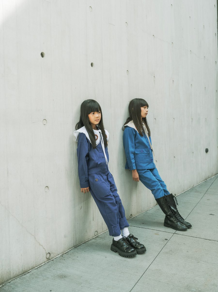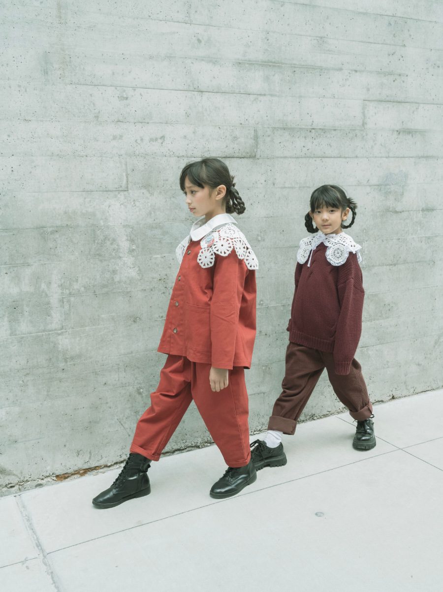 Koko im Merino-Sweater und einer Cordhose von BONNIE & THE GANG, Faye trägt ein Worker-Outfit von SMALLER EXPLORER. Häkel-Kragen von OÛCOLLIE