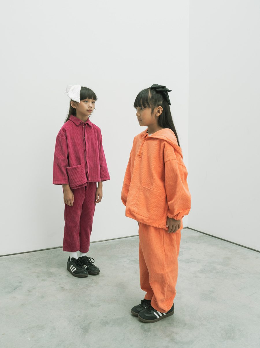 Faye trägt einen Cord-Anzug von BONNIE & THE GANG, Koko eine Loose-Fit-Version von SMALLER EXPLORER. Cool dazu: ADIDAS Samba Sneaker, Socken von COLLÉGIEN