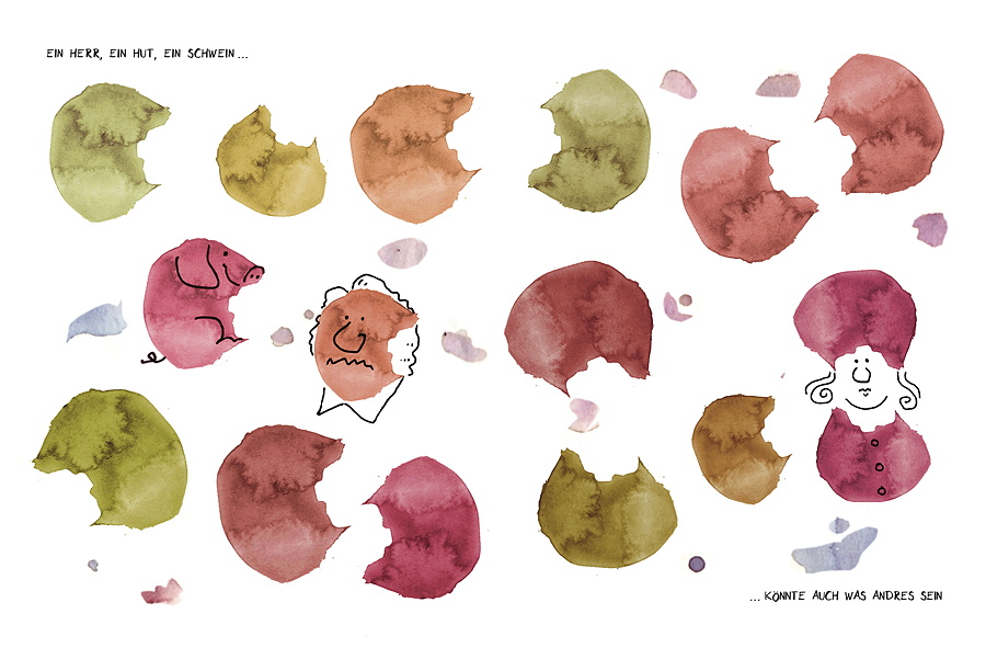 Dieses Buch ist nur der Anfang. Vom HIRAMEKI-Geist beflügelt wird es kein Halten mehr geben: Flecken auf dem Tisch, an der Wand, am Hemd werden immer und überall zur Ausgestaltung rufen. Brauchbar sind da fruchtige Säfte, vor deren Flecken auf dem weißen T-Shirt die gute Ariel-Klementine immer gewarnt hat, aber auf einem schönen saugfähigen Papier erblühen Fantasie-Wesen. Hab’ Spaß, mach’ dich schmutzig! Probier’ Sachen aus, die du noch nie versucht hast, um Farben für Flecken zu finden. Zum Beispiel das Blaulila von frischgepresstem Blaukrautsaft, das durch einen Tropfen Zitronensaft pink aufleuchtet, mit einem Tropfen Spülmittel jedoch ergrünt. Gut als „Fleckmittel“ geeignet sind farbige Flüssigkeiten, die gar nicht zum Malen gedacht sind, aber in ihrer Wirkung normale Malkasten-Farben übertreffen, weil sie eben nicht standardisiert sind und im Trocknungsverhalten mit Rändern und Schattierungen aufwarten, die deine Fantasie herausfordern.