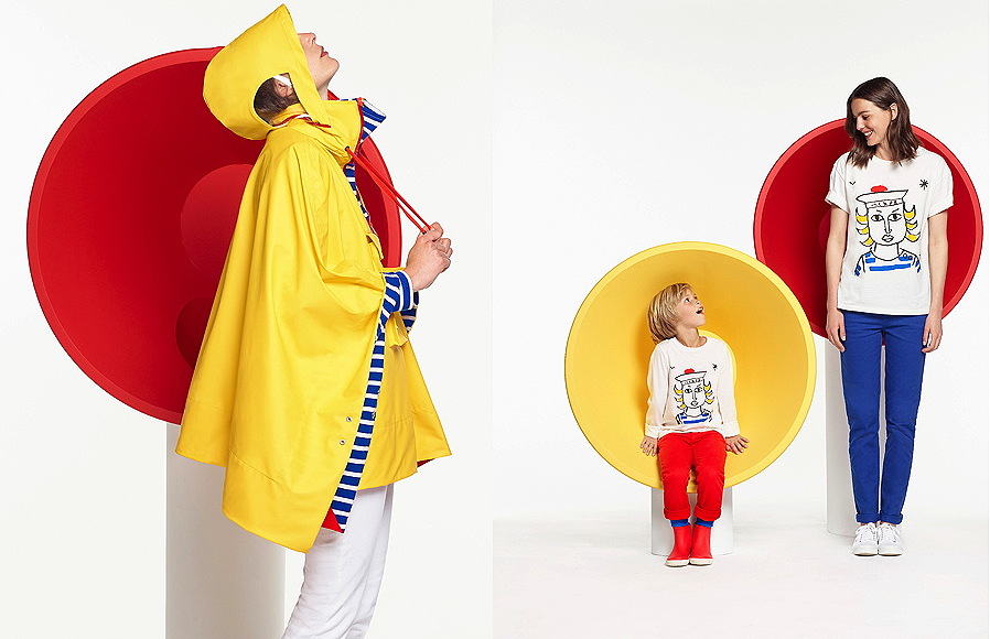 Castelbajacs Faible für kräftige Töne zieht sich wie ein roter Faden durch die ganze Kollektion. Farbenfrohe Prints wie das Porträt eines tagträumenden Matrosen zieren T-Shirts und Sweater, die altbewährte Petit Bateau-Regenjacke wird zum Poncho und die klassische Marinière zeigt sich, ganz im Sinne der Pop Art, mit leuchtend gelben Schulterepauletten.