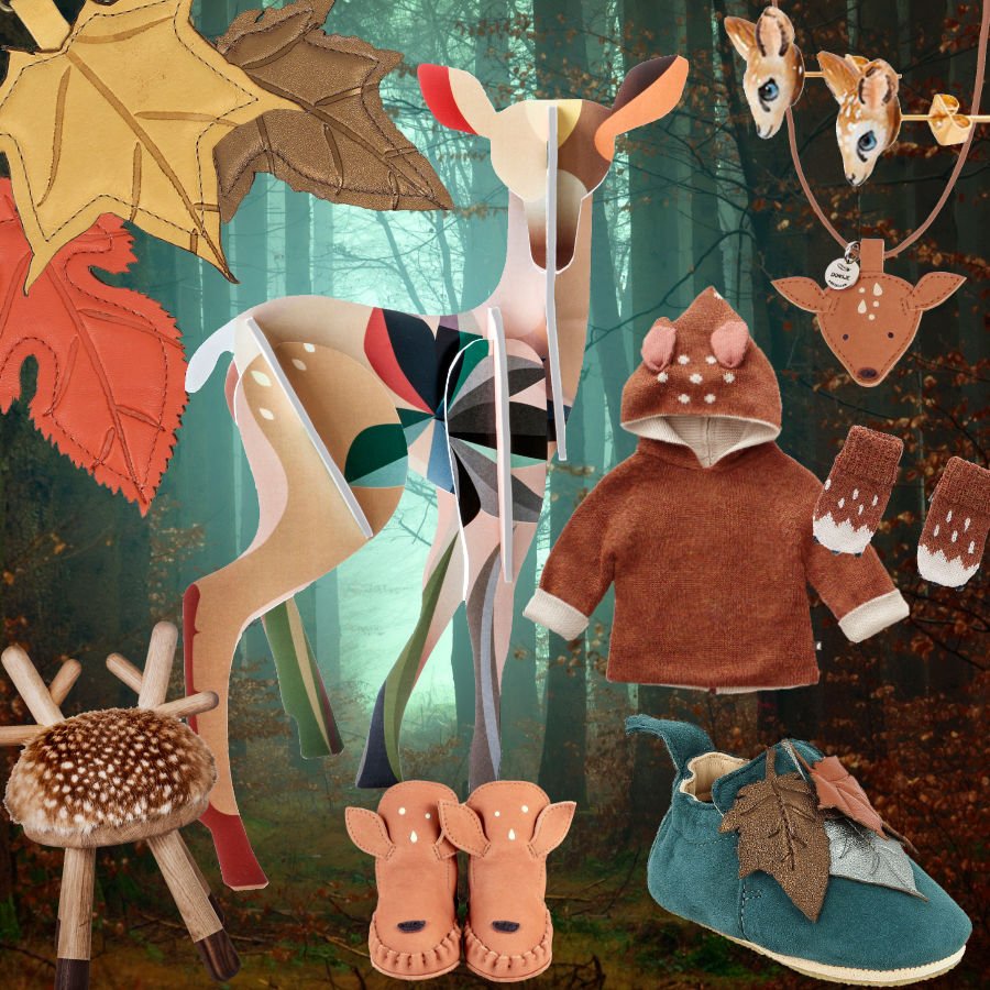 Unsere Auswahl zum neuen Kinderbuchklassiker leuchtet in den schönsten Farben des Herbstes (von oben nach unten im Uhrzeigersinn): Porzellan-Ohrringe von Nach | Deer Necklace von Donsje | Bambi Hoodie von Oeuf NYC | Bambi Fäustlinge von Oeuf NYC | Krabbelschuhe von Easy Peasy | Bambi-Babyschuhe von Donsje | Bambi-Hocker von Elements Optimal | Totem Reh zum Zusammenbauen von Studio Roof | Blatt-Anhänger (Eiche, Ahorn und Platane) von Easy Peasy.