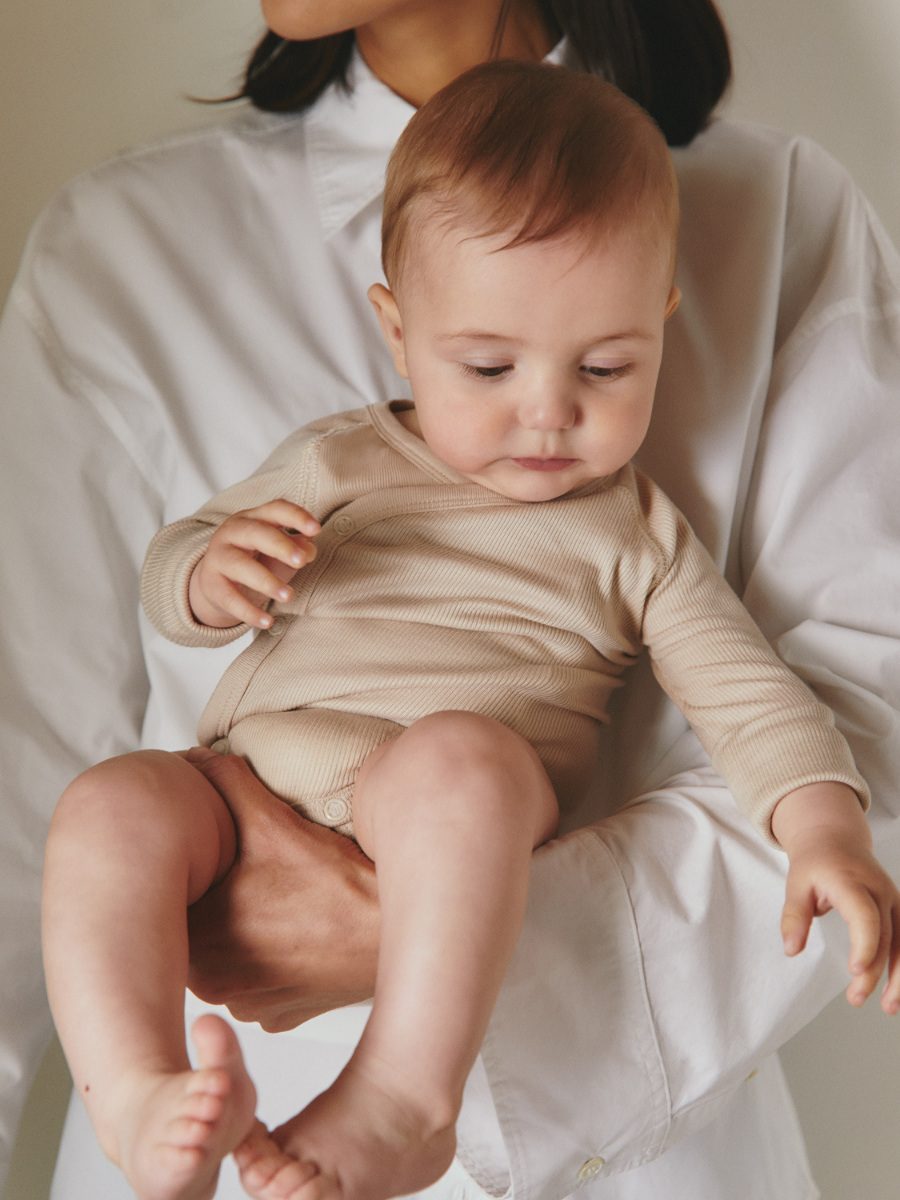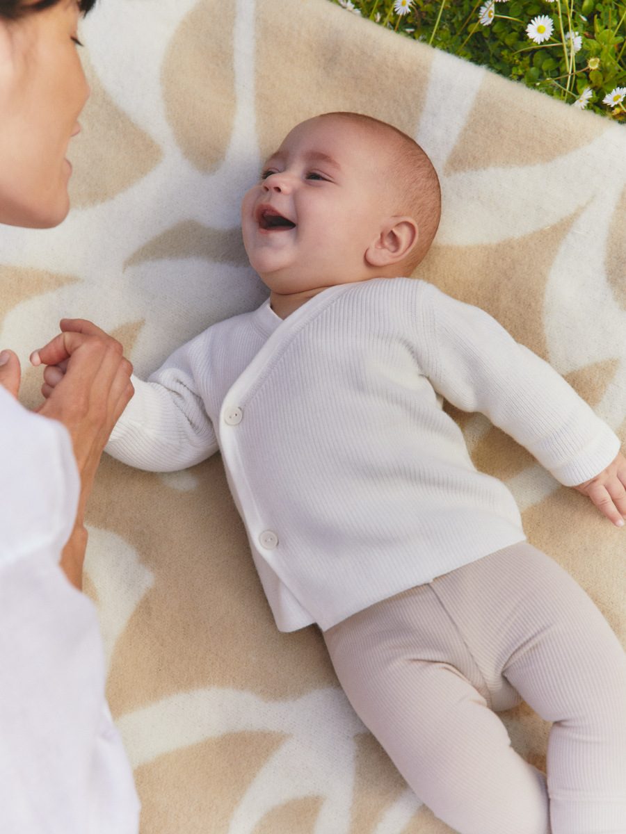 Sommerbabys haben das große Los gezogen. Die Sonne scheint ihnen direkt in den Kinderwagen. Für Babys ersten Ausflug hat ARKET ein Ensemble entworfen, das einfach perfekt mit Mamas Quiet Luxury-Look harmoniert. Und kein Aua, denn das lästige Über-Den-Kopf-Ziehen entfällt dank eines Cache Coeur-Cardigans und die supersoften Leggings umhüllen gleichermaßen sanft zarte wie pralle Schenkelchen.