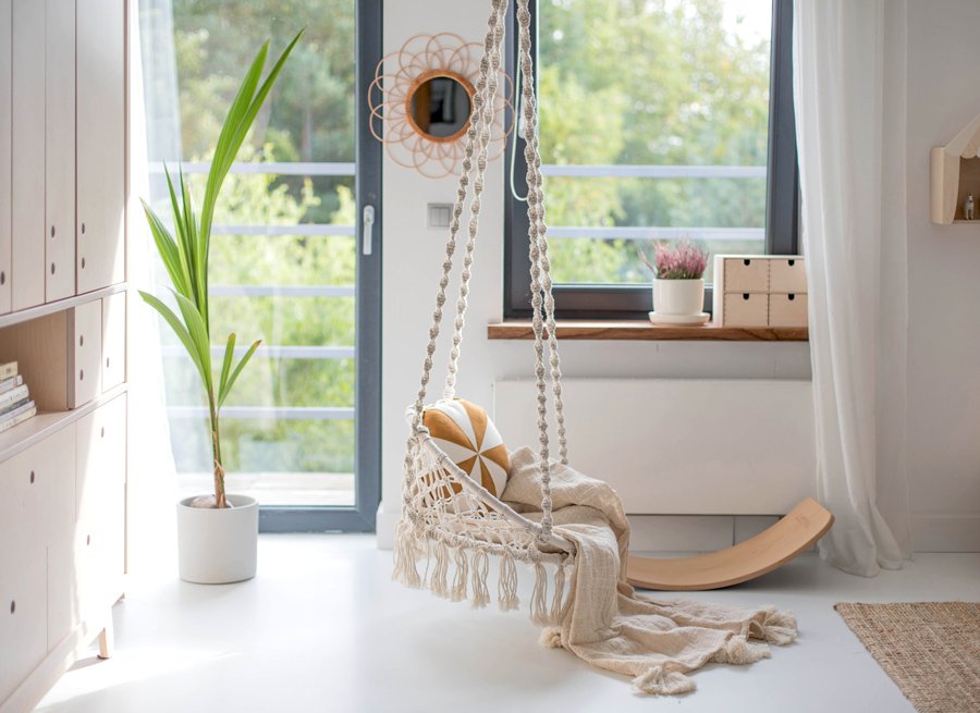 Ein guter alter Interior-Tipp lautet: „Nie alle Einrichtungsgegenstände aus einem Guss wählen, denn die rotten sich zusammen und machen uns fertig!“ Viel aufregender ist es, unterschiedliche Stilrichtungen und Materialien zu mixen. Zum reduzierten Design der Grundmöbel kombinierte Kamila Snela Boho-Elemente in Naturtönen wie das Bambusregal von Kids Depot, die Makramee-Hängeschaukel von BOHO SWING und einen robusten Juteteppich von IKEA.