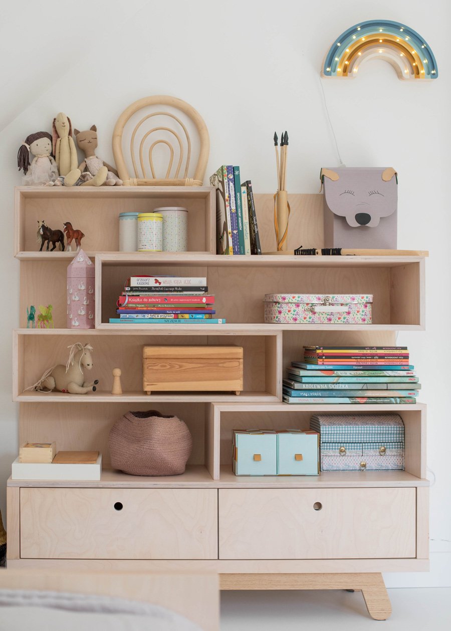Zwar war Zosias Roof Bed ein echter Eyecatcher, kollidierte aber optisch mit der Dachschräge. Um das Kinderzimmer luftiger wirken zu lassen, haben sich Ania und Kamila für das schlichtere Kinderbett aus der Peekaboo-Kollektion von KUTIKAI entschieden. Das Bett plus Schrank und Bücherregal aus derselben Serie sind allesamt aus hellem Birkensperrholz getischlert. Mit seinen ausgestellten Beinen in Eichenfurnier bildet das zurückhaltende Trio eine hochwertige Einrichtungsbasis im trendigen Midcentury-Stil.