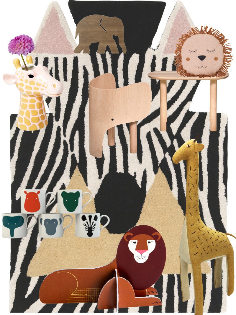 Heiterkeit von der Wandleuchte bis zum Trinkbecher: Auch König Mufasa und der weise Affe Rafiki sind mit von der Partie … (von oben nach unten im Uhrzeigersinn): Zebra Teppich von EO | Löwen-Kissen von Ferm Living | Holztisch Elefant von Marc Venot für EO | Holzstuhl Elefant von Marc Venot für EO | Giraffe Ziffa von Carapau | Aufstellkarte Löwe von Studio Roof | Animal Mugs von Marc Venot für EO | Vase Giraffe von Rice | Wandleuchte Elefant von Ferm Living.