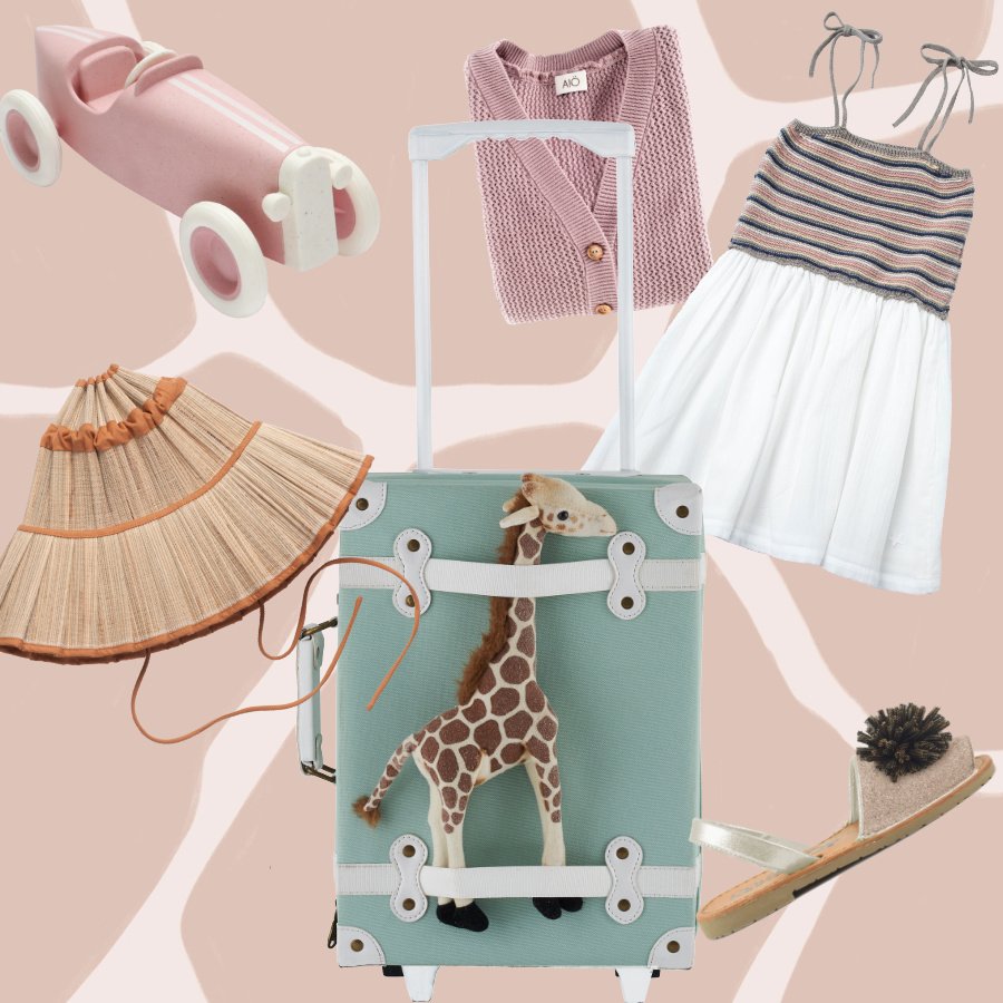 (Von oben nach unten im Uhrzeigersinn): Cardigan von AIÖ | Kleid von Tocoto Vintage | Menorca Sandalen von Colors of California | Koffer See-Ya von Olli Ella | Capri Hut von Lorna Murray | Rennauto aus Holz von Ooh noo | Für den Tapetenwechsel zuhause: Tapete Savanna (Background) von Murals Wallpaper.