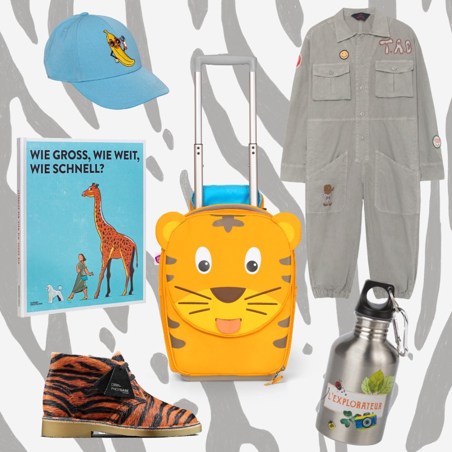 (Von oben nach unten im Uhrzeigersinn): Jumpsuit von The Animals Observatory | Edelstahl Trinkflasche von Moulin Roty | Kinderkoffer Timmy Tiger von Affenzahn | Desert Boots von Clarks x National Geographic | Kinderbuch „Wie gross, wie weit, wie schnell ?“ von Kleine Gestalten | Baseball Cap von Mini Rodini | Für den Tapetenwechsel zuhause: Tapete Fierce (Background) von Murals Wallpaper.