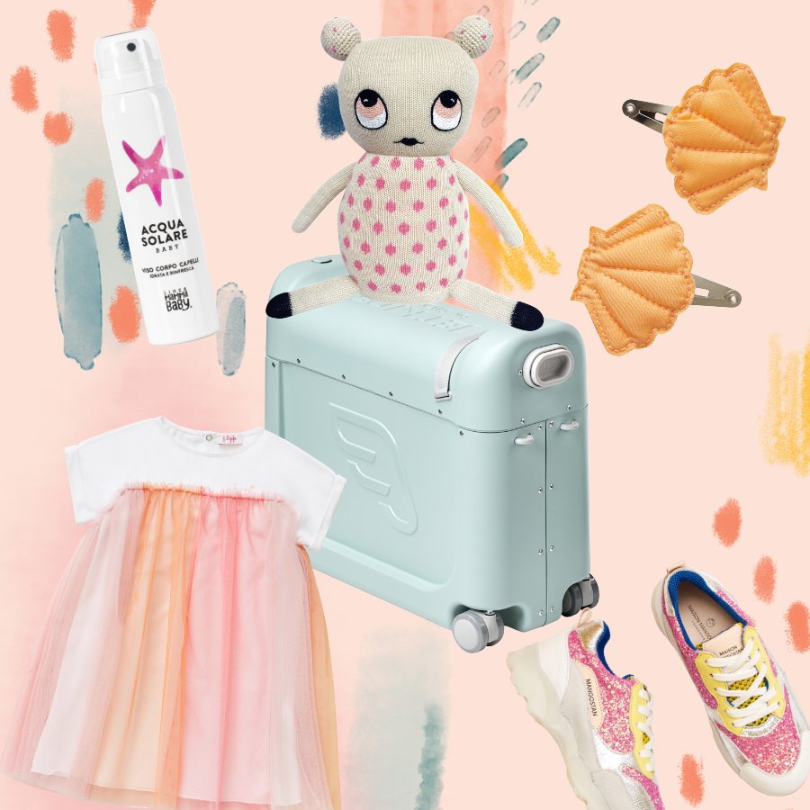 (Von oben nach unten im Uhrzeigersinn): Puppe Bunty von Lucky Boy Sunday | Muschel Haarspangen von Il Gufo | Glitter Sneakers von Maison Mangostan | Bedbox Jetkids by Stokke | Kleid von Il Gufo | Feuchtigkeitsspray von Linea MammaBaby | Für den Tapetenwechsel zuhause: Tapete Shading (Background) von Murals Wallpaper.