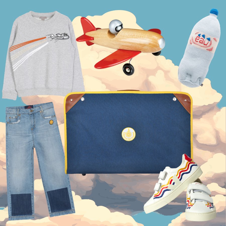(Von oben nach unten im Uhrzeigersinn): Retro Flugzeug von Vilac | Water Bottle Soft Toy von Oeuf NYC | Faltbarer Koffer von Leçons de Choses | Sneakers von Veja x Hundred Pieces | Jeans von The Animals Observatory | Airplane Sweatshirt von Emile & Ida | Für den Tapetenwechsel zuhause: Tapete Nimbus (Background) von Murals Wallpaper.