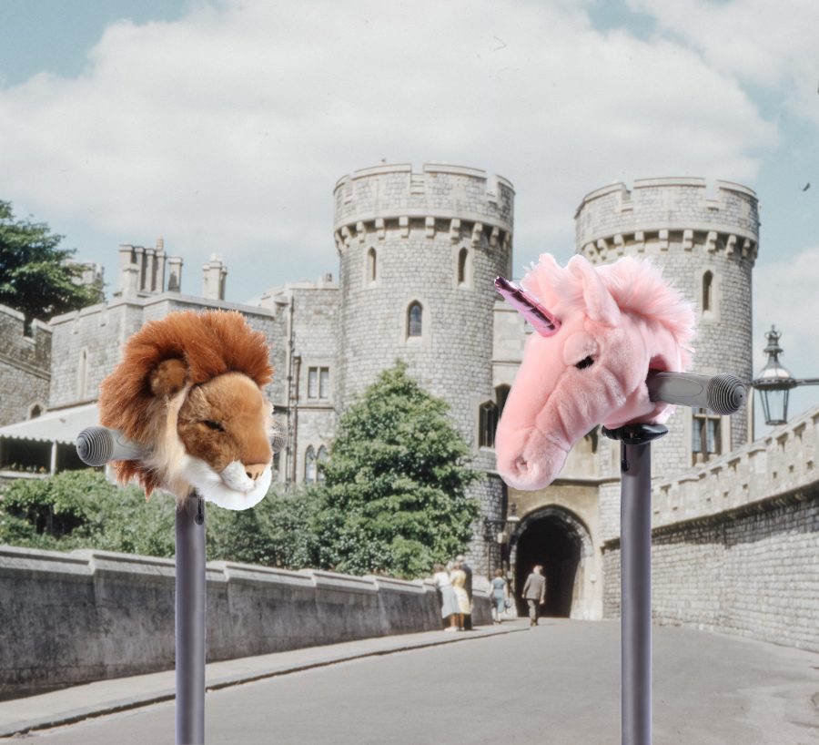 Wie könnte man ökologischer und royaler zum Krönungskonzert nach Windsor Castle düsen? Die königlichen Wappentiere gleich vorne auf die Lenker gespickt: Das Einhorn, Schottlands Nationaltier, und der Löwe als Symbol für England krönen neuerdings als Scooter Heads den belgischen Kuscheltierpark WILD & SOFT.