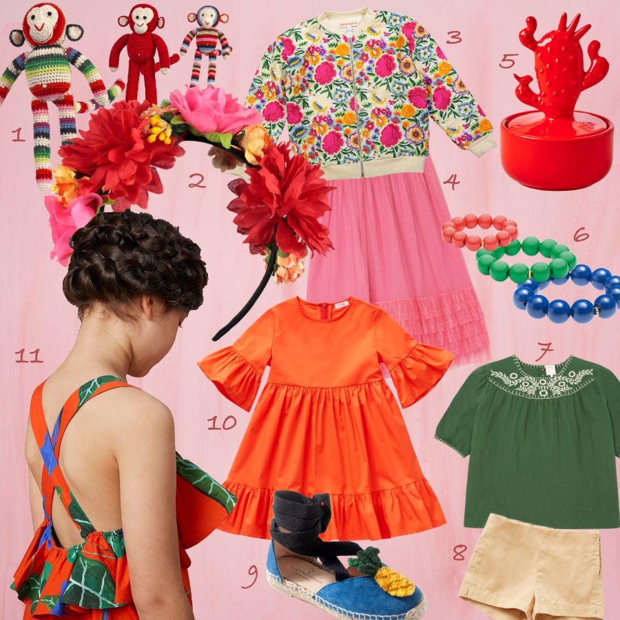 100 % Frida Kahlo! Ob eine Bluse mit Folklorestickerei, bunte Holzarmbänder und die von der Künstlerin so geliebten Blumen – Fridamaniacs werden hier fündig: Klick‘ einfach auf den jeweiligen Link und gelange so zu deinem Wunschobjekt … 1 Häkeltiere von Anne-Claire Petit | 2 Haarreif mit Blumen von Molo | 3 Bestickte Bomberjacke von Anne Kurris | 4 Rüschenrock von The Animals Observatory | 5 Schmuckdose von Rice | 6 Woody Bracelets von Mamaradscha | 7 Bestickte Bluse von Little Karl Marc John | 8 Shorts von Il Gufo | 9 Espadrilles von Maison Mangostan | 10 Rüschenkleid von Il Gufo | 11 Trägerkleid von Milk & Biscuits.