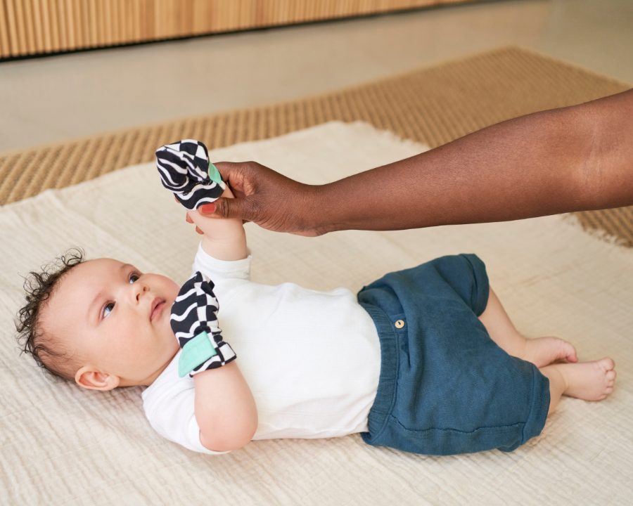 Babys sind von Schwarz-Weiß-Mustern fasziniert: Die Fäustlinge aus dem Beobachter-Set fördern das Körperbewusstsein