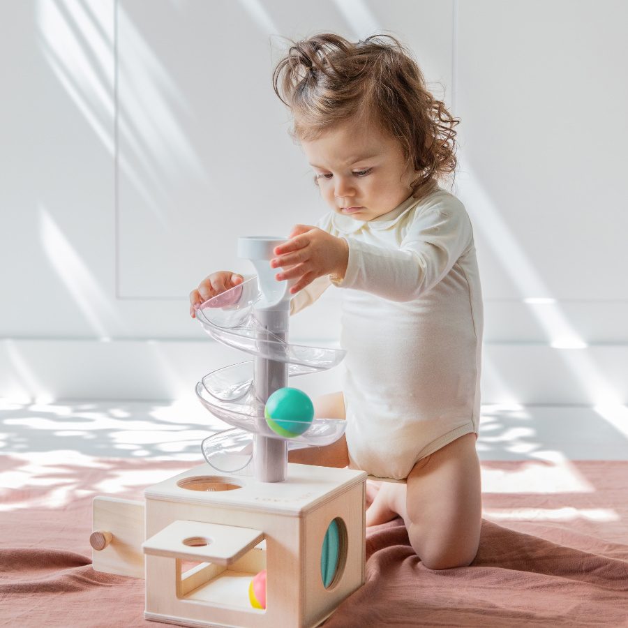 Lernspielzeug für Kinder: Die zweispurige Rennbahn-Rampe vermittlet das Phänomen der Schwerkraft ganz spielerisch