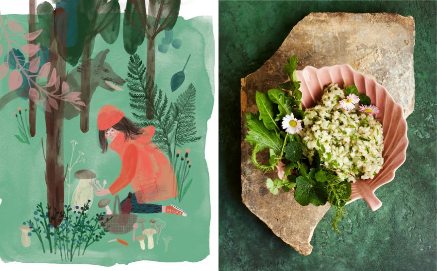 Rotkäppchen geht vom Wege ab: Wald-Wiesen-Risotto mit Löwenzahn und Gänseblümchen. Ill. © Rinah Lang/Foto © Katrin Winner