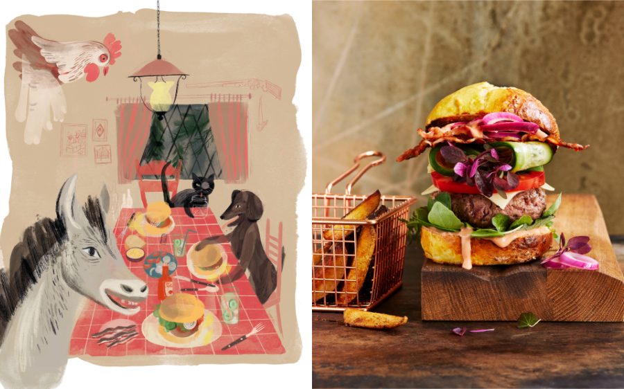 Bei den Bremer Stadtmusikanten wird „hochgestapelt“: der Burger mit Banditenkartoffeln. Ill. © Rinah Lang/Foto © Katrin Winner