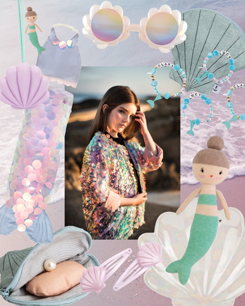 Mermaid Mania! Der Mermaid Trend ist auch 2019 nicht mehr aufzuhalten und das sind die schönsten Meeresschätze … (von oben nach unten im Uhrzeigersinn): Shell Sunnies von Sunnylife | DIY-Armbändchen von Sunnylife | Meerjungfrau Chloé von Lauvely | Muschelschale von Sunnylife | Haarspangen von Sunnylife | Austern-Etui von Don Fisher | Mermaid Kostüm von Meri Meri | Muschel-Seife von Sunnylife | Pailletten-Jacke von Andorine.