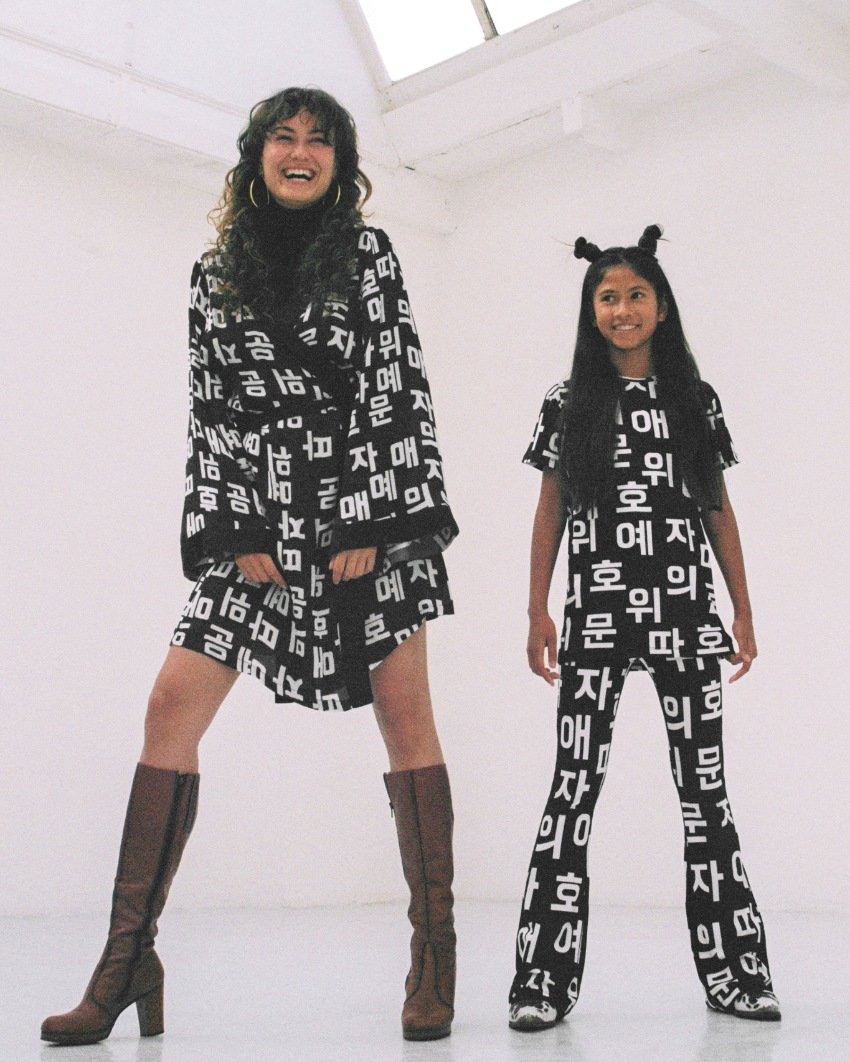 Zweimal Reizüberflutung? Ja bitte! Der Mini Me Look im Flared Pants Trend, garniert mit koreanischem Buchstabensalat