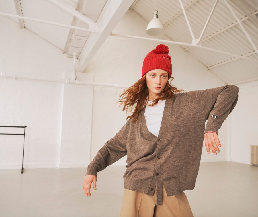 Cardigan mit einem Augenzwinkern: Man beachte die dekonstruierte Knopfleiste, die zarten Stitchings und die legendären Comic-Augen