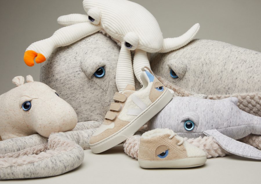 VEJA und BigStuffed verbindet eine langjährige Freundschaft. Schon 2013 verwandelten die gigantischen Meeresbewohner von Dana Muskat VEJAs Centre Commercial Kids in eine riesige Spieloase. Ihre neueste Collab ist nicht minder imposant: Es handelt sich dabei um die wohl knuffigsten und flauschigsten Kuschel-Sneaker weltweit. Dafür ging VEJA auf Tuchfühlung mit Lady Beluga, Grandpa Octopus & Co. Die besohlten Repliken, der V-10 Kindersneaker und der Babyschuh, stehen ihren Vorbildern in Sachen Cuteness in nichts nach: kuscheliges Teddy-Fleece, angerautes Wildleder und dann diese melancholisch dreinschauenden blauen Riesenkulleraugen. Mon dieu, – es ist um uns geschehen!