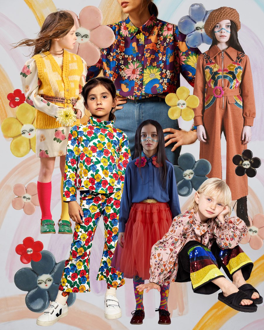 Here have all the flowers gone! (Von oben nach unten im Uhrzeigersinn): Damenbluse aus Dupionseide von Soeur | Retro-Jumpsuit von Raspberry Plum | Schluppenbluse von Christina Rohde | Cordhose mit Paillettenbesatz von Christina Rohde | Viskose-Bluse von Raspberry Plum | Tüllrock von Raspberry Plum | Blumen-Strumpfhose von Raspberry Plum | Veilchen-Ensemble aus Jersey von Mini Rodini | Bedrucktes Kleid aus Twill von The Animals Observatory | Strickweste von The Animals Observatory | Kniestrümpfe von The Animals Observatory | Gürtel „Lovebird“ aus recyceltem Polyester von The Animals Observatory | Lederslipper mit Faux-Fur-Futter von The Animals Observatory | Handgefertigte Blumenbroschen aus Porzellan von Kinska.