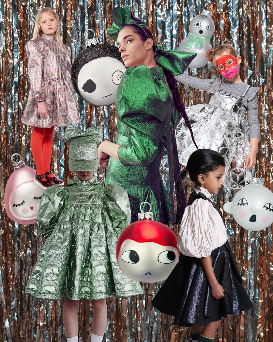 Wer glänzt heuer mehr, die Kugel oder das Kleid? Festtags-Mode in Corona-Zeiten (Von oben nach unten im Uhrzeigersinn): Metallic-Kleid, Haarreif und Scrunchie von Tia Cibani | Gepaddetes Trägerkleid in Silber-Metallic von Christina Rohde | Longsleeve mit Rüschen von Christina Rohde | Metallic-Schürzenkleid von Tia Cibani | Plisseebluse von Tia Cibani | Gepaddetes Metallic-Kleid mit Puffärmeln von Caroline Bosmans | Kappe mit abnehmbarer Schleife von Caroline Bosmans | Kleid „Zig Zag Sparkle Rainbow“ von Repose AMS und Strumpfhose von Repose AMS | Christbaumkugeln von Lucky Boy Sunday.
