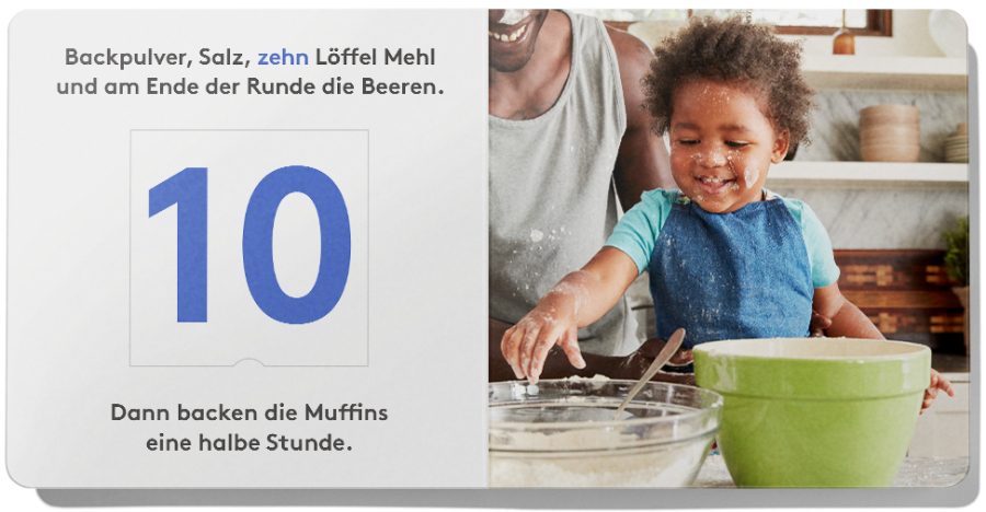 Muffins nach Adam Riese: Unter der aufklappbaren Zehn verstecken sich in der Tat zehn Löffel Mehl, die gemeinsam mit Daddy laut durchgezählt werden. Eine ziemlich clevere Idee von LOVEVERY, Mathe und Muffins in einem Bilderbuch zu kombinieren: „Ich backe Muffins“ aus dem Helfer-Set ist ein typisches Beispiel für die Alltagsbezogenheit der Montessori-Bücher.