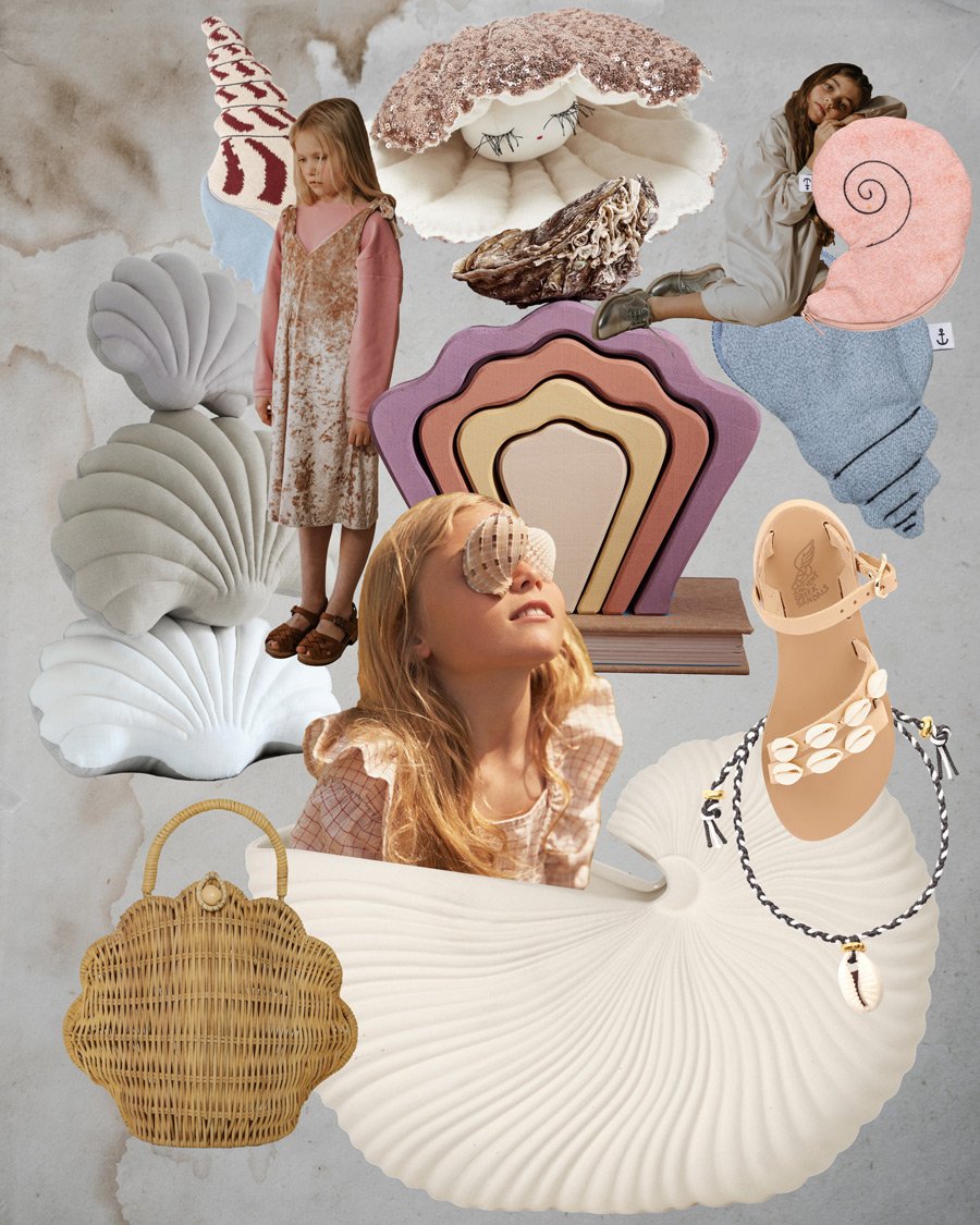 Shelling 2020: Natürliche Perlen sind ein sehr seltenes Phänomen, bei TAMAR MOGENDORFF wird man jedoch in jeder ihrer knuffigen Austern fündig. Das Haus der Kaurischnecke war im China des 13. Jahrhunderts ein Zahlungsmittel, heute baumelt das porzellanartige Gehäuse an den Handgelenken der Influencer. Eine Nautilus Muschel von FERM LIVING steht nicht einfach so auf der Fensterbank rum, sondern erfüllt ihr Dasein als Blumenvase oder Planzentopf … (von oben nach unten im Uhrzeigersinn): Pearl in a Shell von Tamar Mogendorff | Doll Dress von Repose AMS | Muscheltäschchen von Don Fisher | Stapelspielzeug „Shell Arch Stacker“ von Raduga Grëz | Ledersandalen mit Kaurimuscheln von Ancient Greek Sandals | Handgeflochtenes Armband mit Kaurimuschel von Mamaradscha | Shell Pot von Ferm Living | Shell Bag aus Rattan von Olli Ella | Bouquet Bluse von The New Society | Muschelkissen aus Leinen von Tamar Mogendorff | Samtkleid von Repose AMS | Crewneck Sweater von Repose AMS | Fruiticana Muschelkissen von Ferm Living.